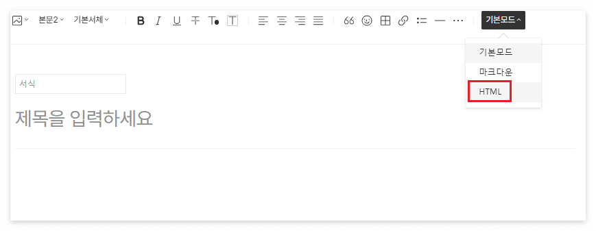 2. 기본모드에서 'HTML' 로 변경해줍니다.