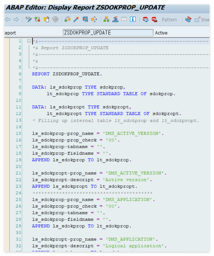 SAP Note 또는 제공받은 REPORT_SDOKPROP.txt 파일의 코드를 복사하여 붙여넣습니다.