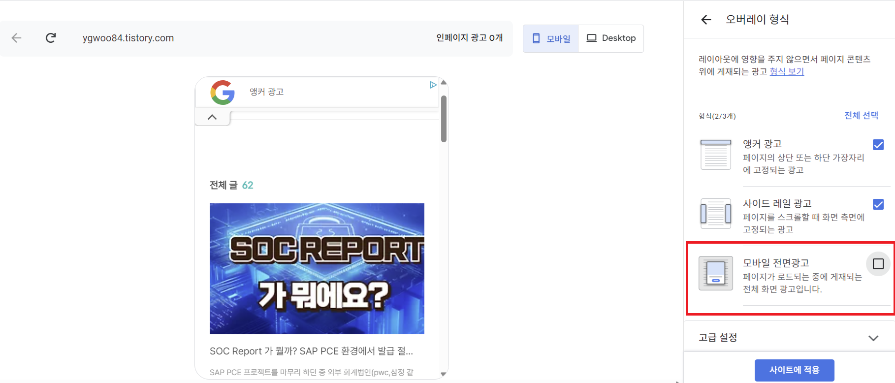 ※ 모바일 전면광고는 PC와 모바일을 구분하지 않는 애드센스의 오버레이(화면을 덮는) 형 자동 광고입니다.