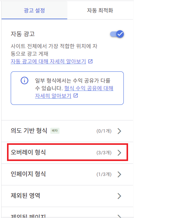 4. “광고 설정”에서 “오버레이 형식” 클릭