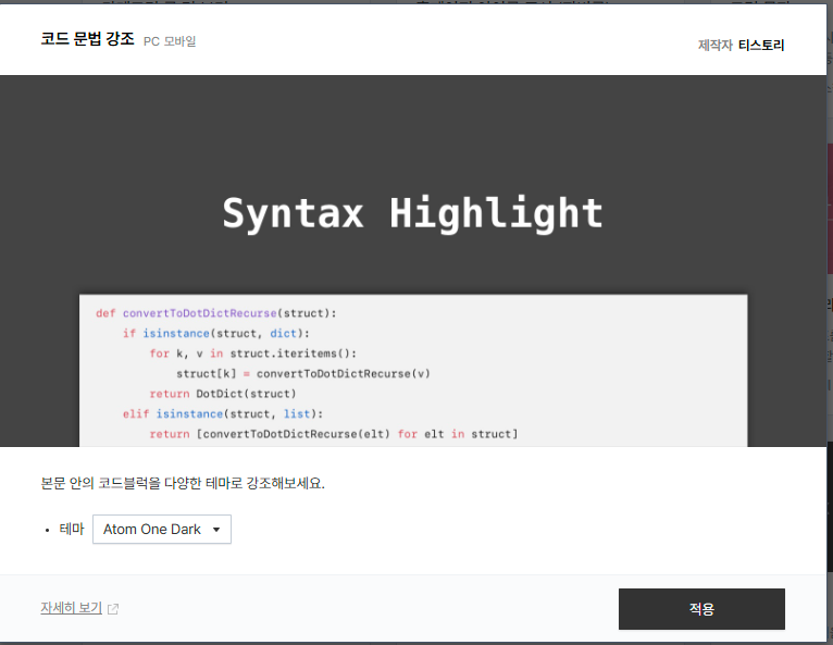 마지막으로 'syntax highlight' 플러그인을 다시 적용 후 하이라이트 테마를 적용 해줍니다.