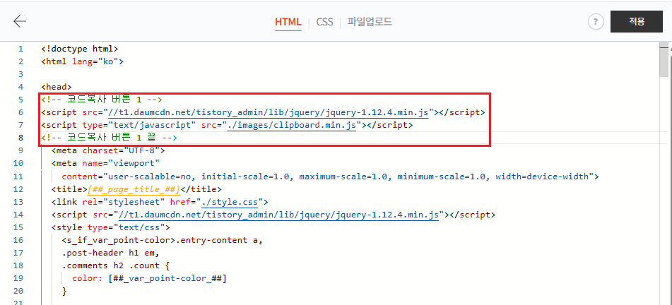 1. HTML 탭을 이동 후 <head> 바로 아래 부분에 코드를 붙여넣기를 해준 후 적용을 눌러줍니다.