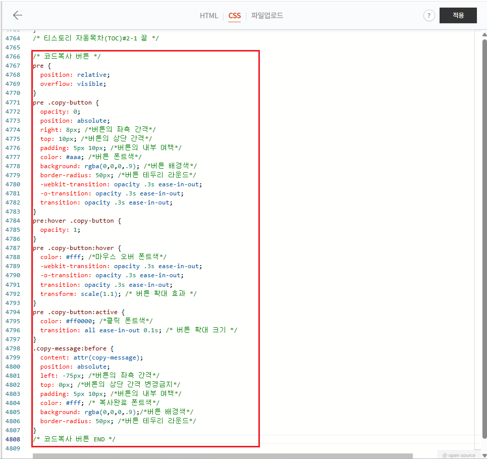 CSS 탭으로 이동 후 가장 아랫부분에 코드를 붙여넣기 해줍니다.