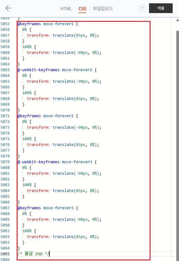 CSS 탭으로 이동 후 아래 코드를 맨 하단에 붙여 넣기 해줍니다.