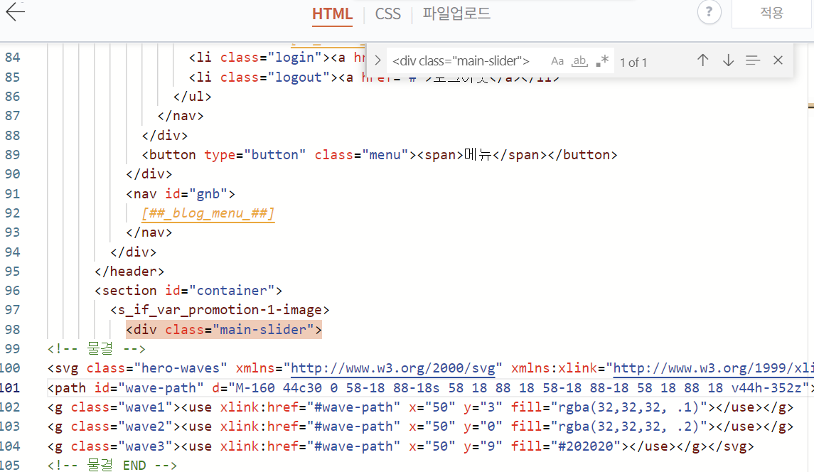 관리자 홈 > html 편집 > html 탭으로 가서 <div class="main-slider">> 를 검색하여 줍니다.