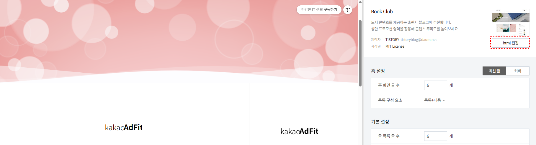 관리자 홈 > 스킨 편비 > html 편집에 들어가 HTML 탭에 들어갑니다.