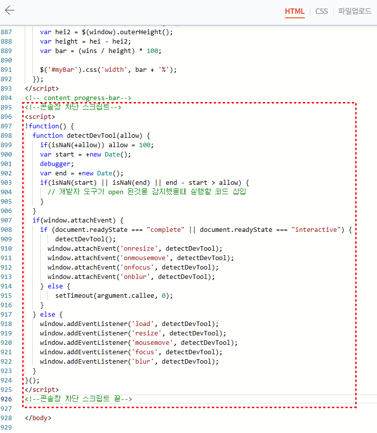 // 개발자 도구가 open 된것을 감지했을때 실행할 코드 삽입