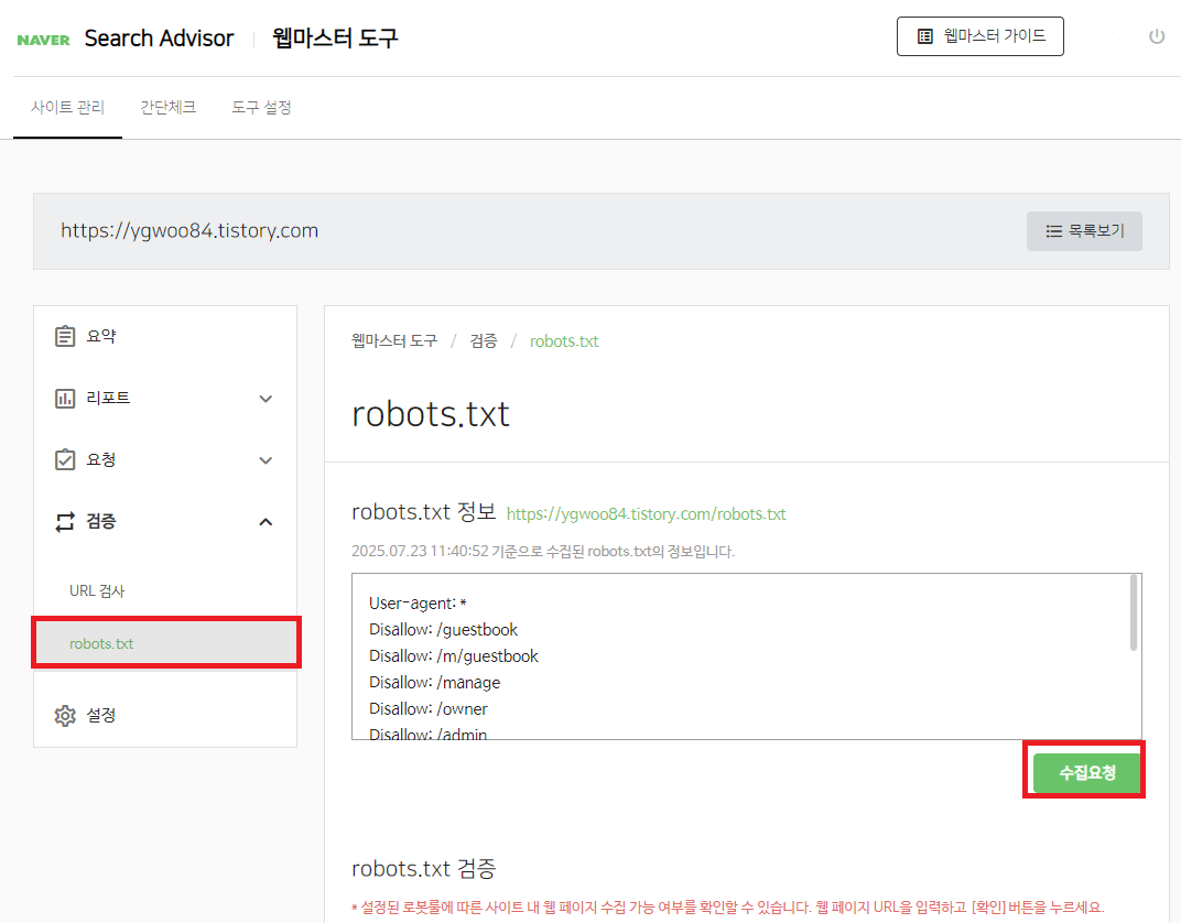 다시 네이버 웹마스터 화면으로 가서 /robots.txt를 url에 추가 해준뒤 "확인"을 클릭해 정상 수집이 되는지 확인 해줍니다.