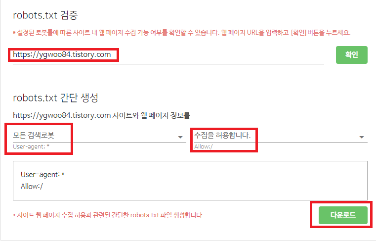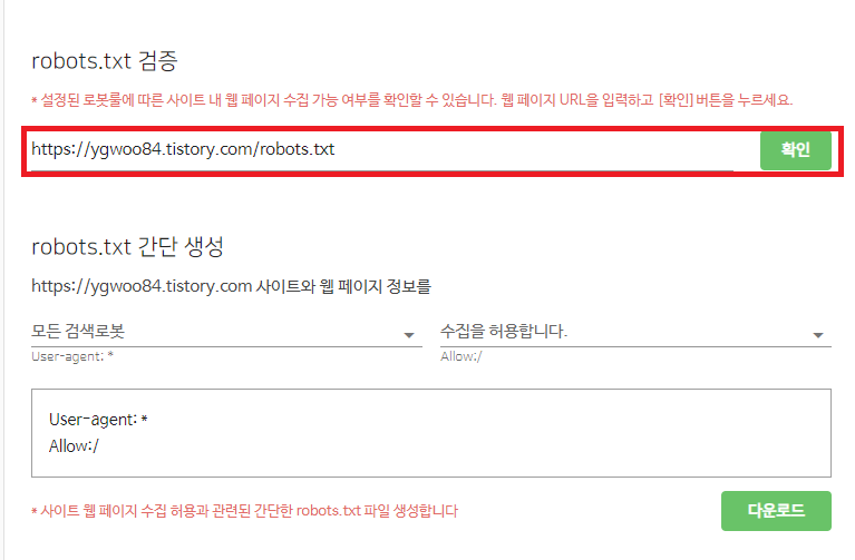 robots.txt 간단 생성에서는 모든 검색로봇, 수집을 허용합니다를 선택해줍니다.