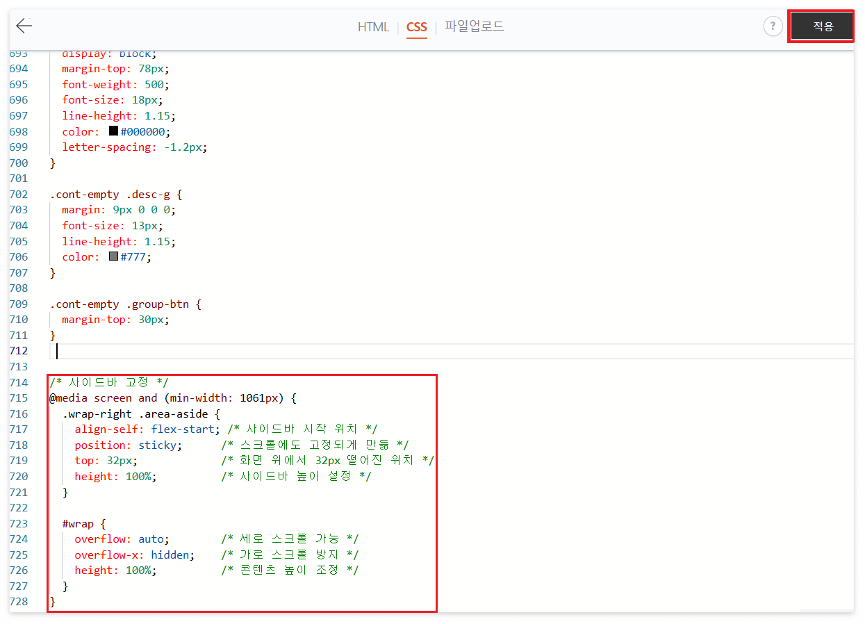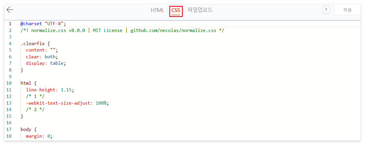 html 편집 화면 들어간 다음 'CSS' 탭을 클릭해줍니다.