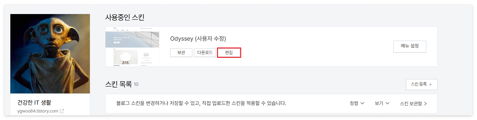 다음은 사이드바 고정을 위해 스킨 편집 메뉴로 진입해서 CSS 수정해보겠습니다.